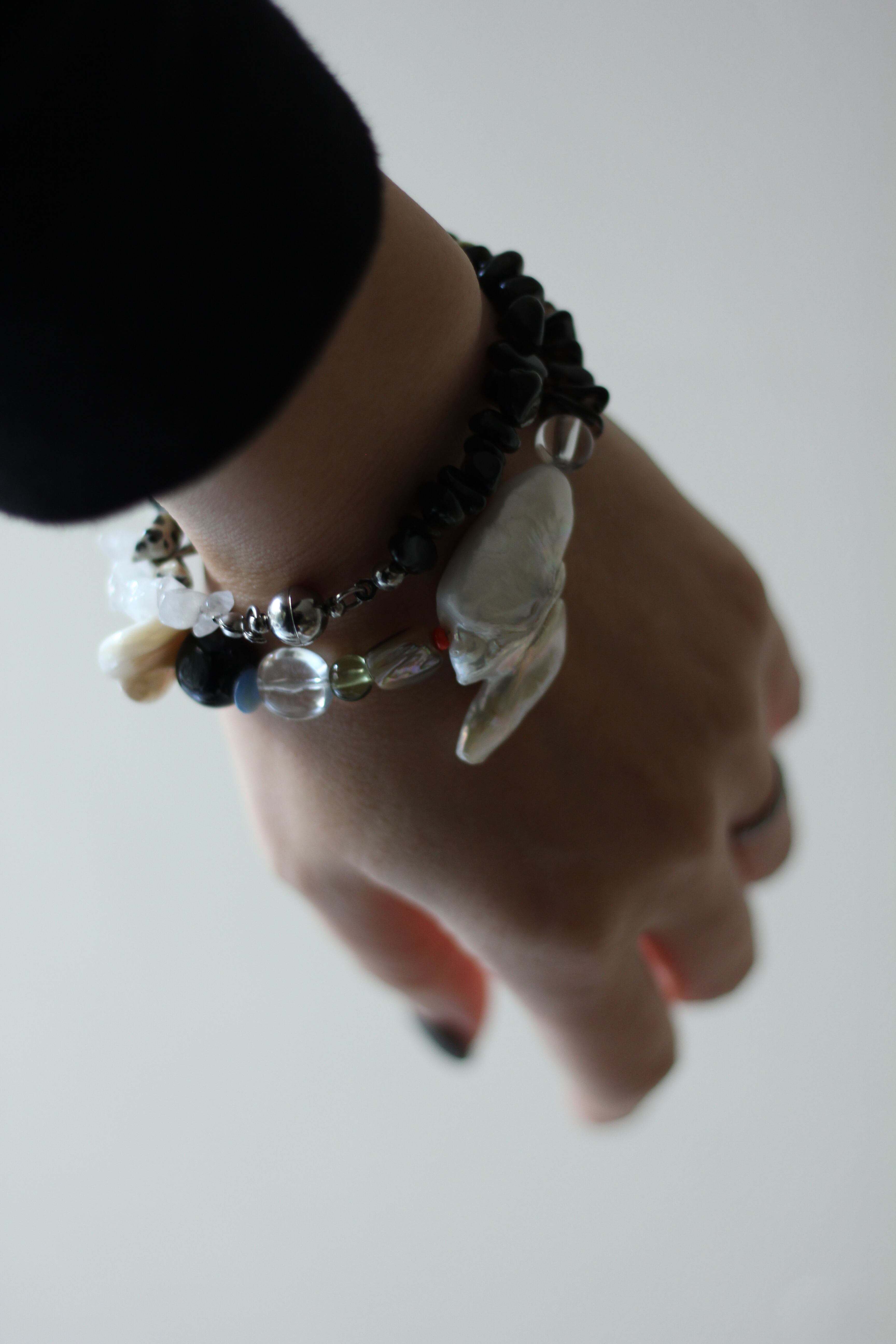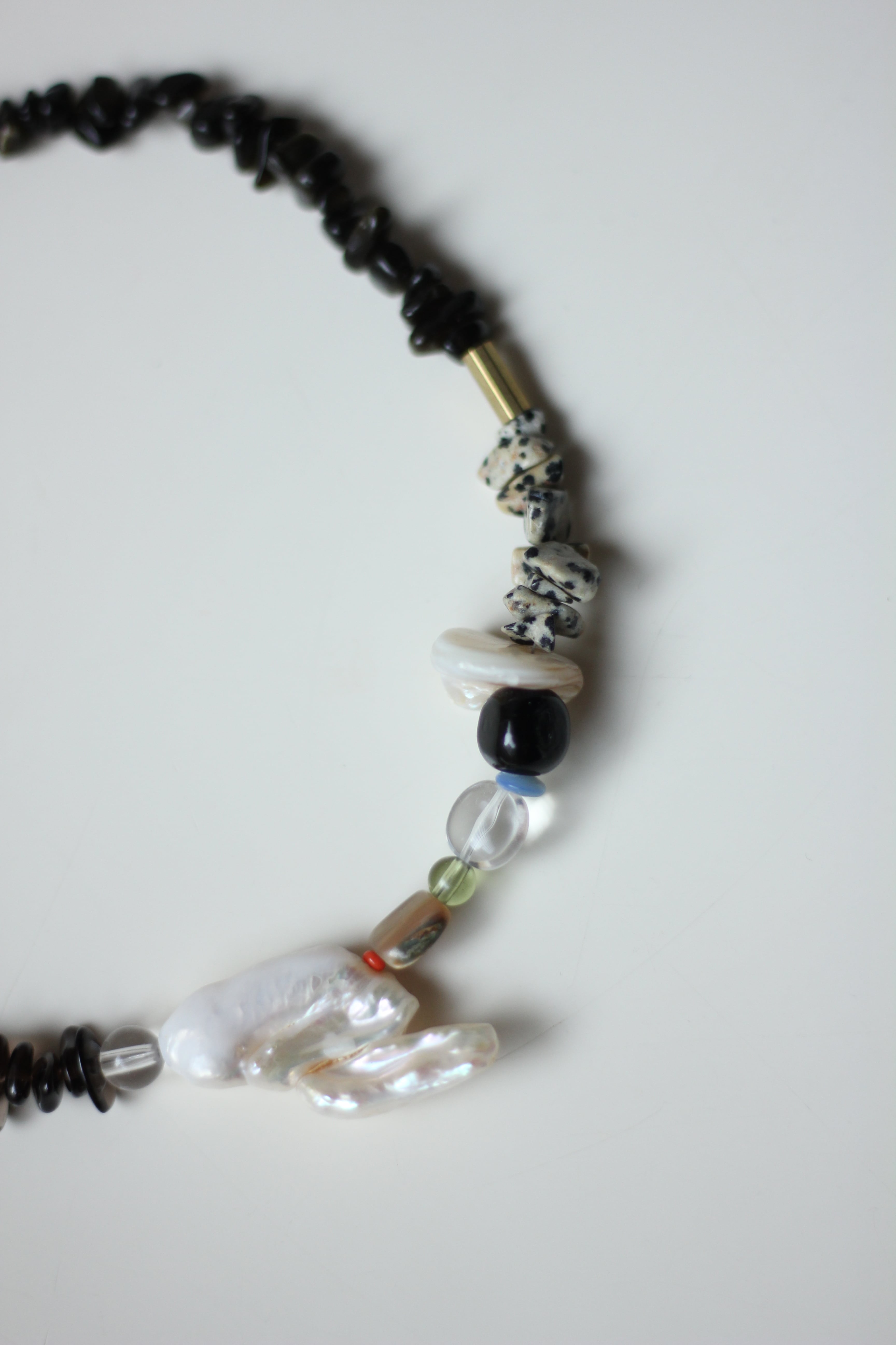 ゴールデンオブシディアン・クリスタル・スモーキークォーツ・ダルメシアンジャスパー・淡水パール・シェル