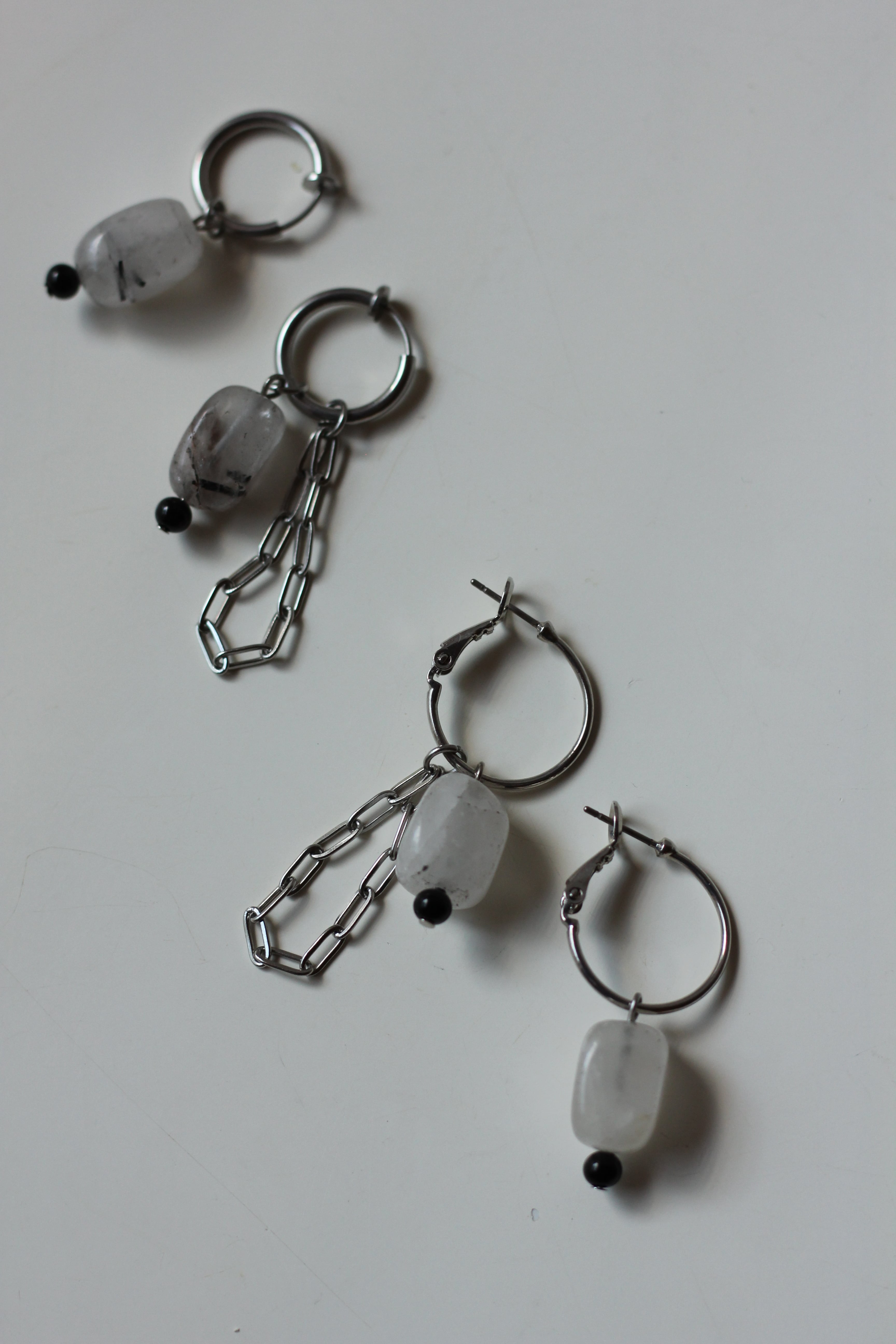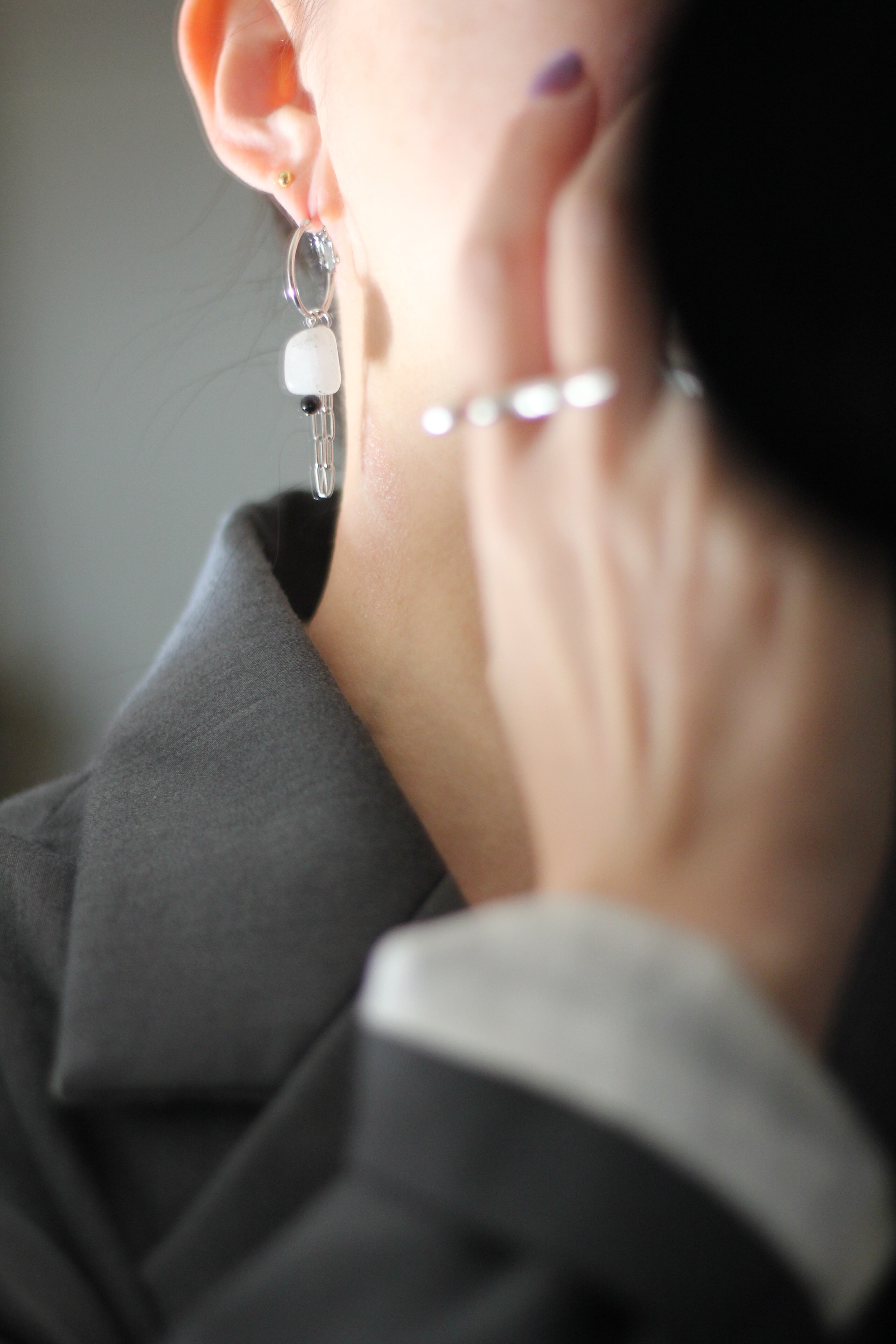 乳白色の天然石を使用したstone pierceは、その独特な色合いや模様が特徴で、どんなシーンにもぴったりなアクセサリーです。シンプルなデザインながらも、目を引く美しさで、日常使いはもちろん、特別な日のおしゃれにも最適です♪